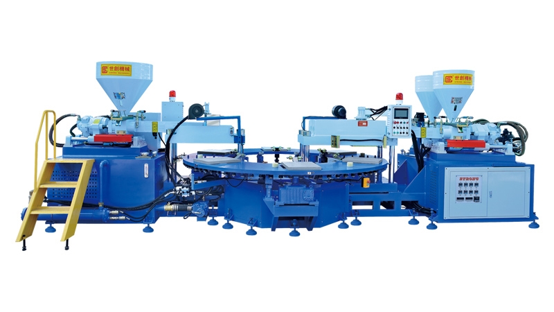 SC-606-3-100T全自動回轉式塑膠類三色幫帶注射成型機(臥式)1.該機臺配備多功能操作系統,可生產單色、雙色及三色等不同顏色的PVC鞋帶,也可生產童鞋鞋底。